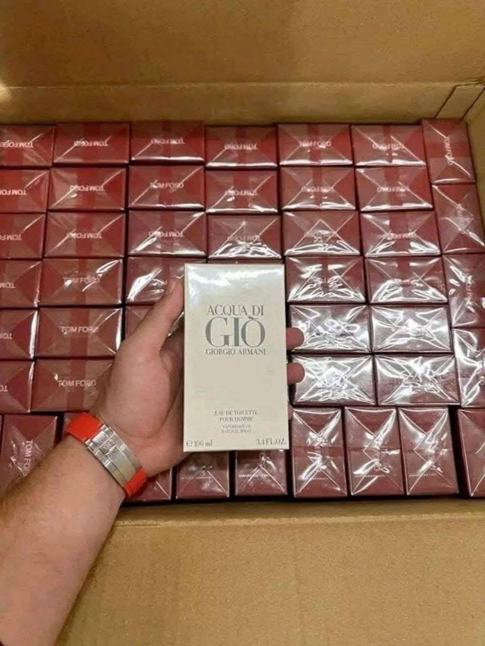 The pallet includes a mixed assortment of top-selling men’s perfumes, such as: